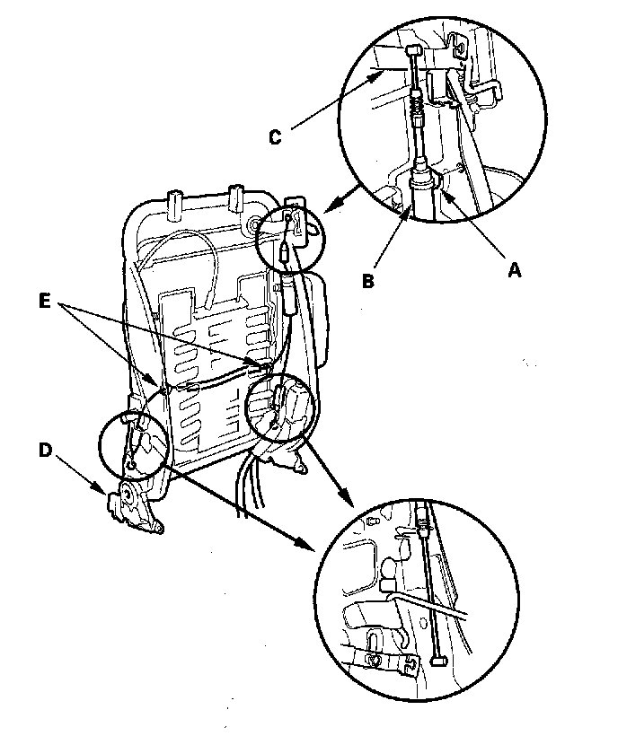 4. Detach the cable clip (A), and disconnect the rear seat access cable (B) from the rear seat access lever (C) and both recline adjusters (D). Release the wire ties (E), then remove the cable.