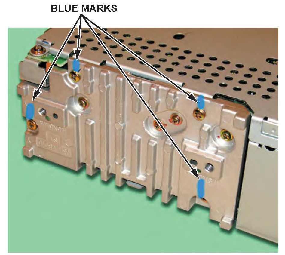 4. Using the blue marker, mark the four 3 x 8 mm screws on the audio unit's heat sink as shown. Then remove the four screws, and place them in the section of the screw container marked with the blue dot.