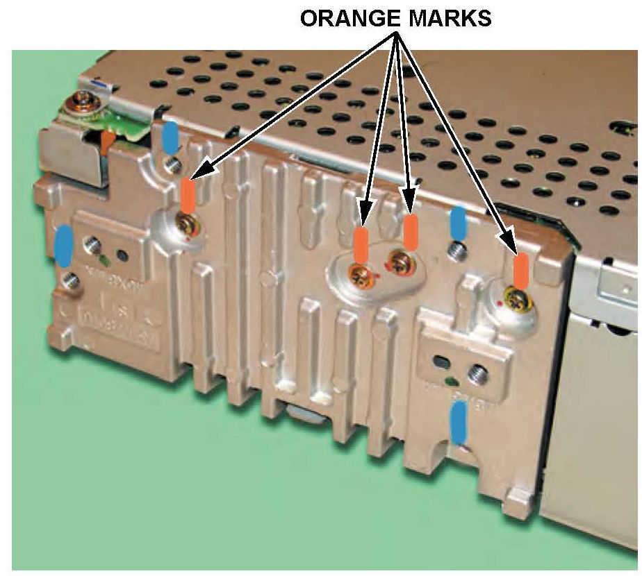 5. Using the orange marker, mark the four 2.6 x 16 mm screws on the heat sink as shown. Then remove the four screws, and place them in the section of the screw container marked with the orange dot.