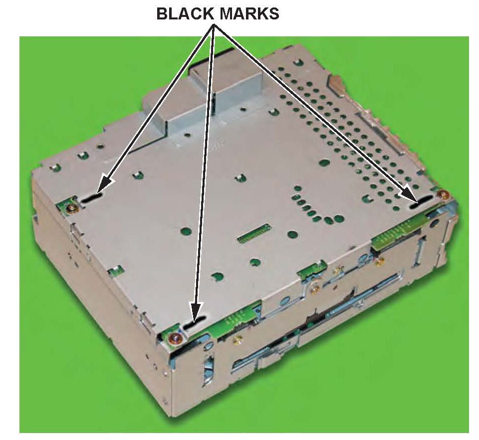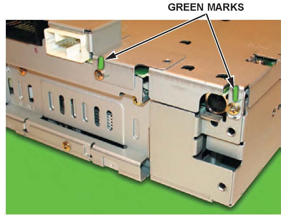 7. Using the green marker, mark the two screws on the back cover of the audio unit as shown. Then remove the two screws, and place them in the section of the screw container marked with the green dot.