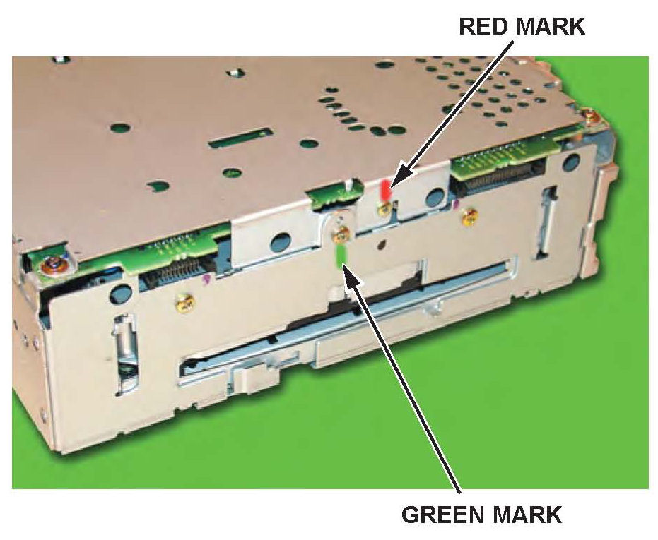 8. Using the green marker, mark the large screw on the front lower cover of the audio unit. Also, mark the small screw with the red marker. Then remove the two screws, and place them in the appropriate sections of the screw container marked with the green dot and the red dot.