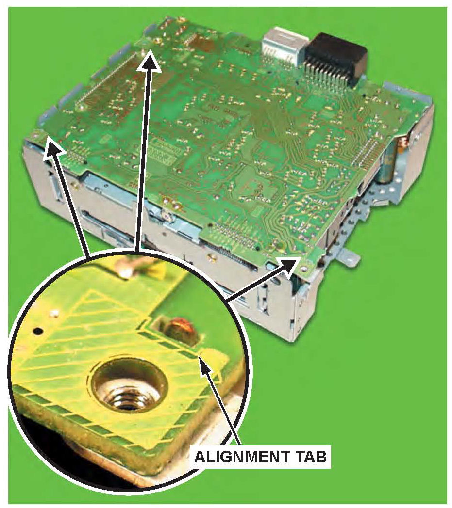 14. Carefully place the new PCB into the audio unit. To ensure proper PCB placement, align the three alignment tabs and screw holes.