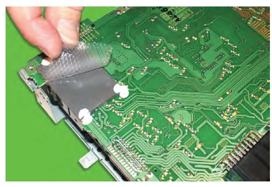 15. Carefully remove the protective cover from the gray thermal pad on the new PCB.