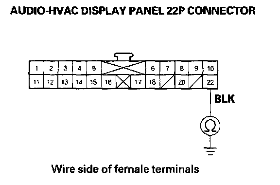 6. Check for continuity between the No.22 terminal of audio-HVAC display panel 22P connector and body ground.