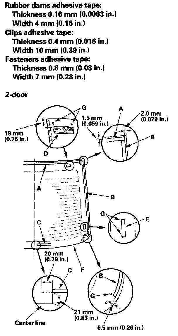 - 2-door: With the printed dots (E) on the rear window as a guide, apply the adhesive to both side portions of the rear window.