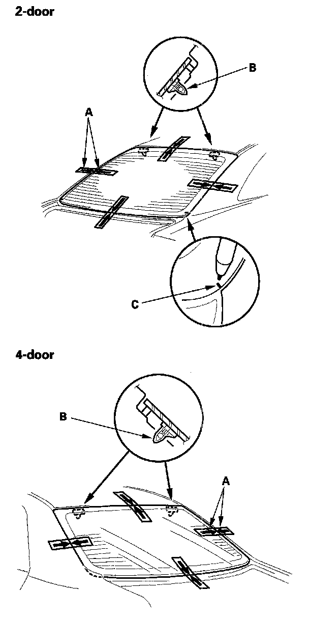 16. 2-door: Make alignment marks (C) to the rear window with a grease pencil as shown where the molding will be installed.