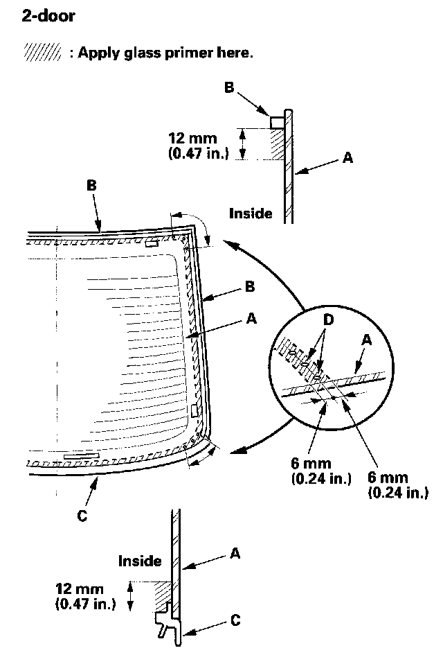 - 2-door: With the printed dots (D) on the rear window as a guide, apply the glass primer to both lower corner portions of the rear window.