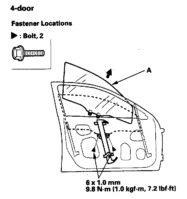 4. Carefully raise the glass (A) until you can see the bolts, then remove them. Carefully pull the glass out through the window slot. Take care not to drop the glass inside the door.