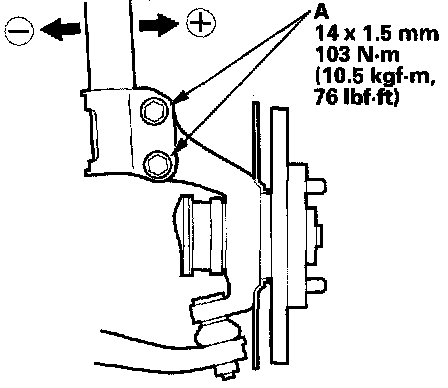 NOTE: The camber angle can be adjusted up to ± 15' (center of tolerance) by replacing one damper pinch bolt with the adjusting bolt (P/N 90188-S5A000). The camber angle can be adjusted up to ± 30' by replacing both upper and lower damper pinch bolts with the adjusting bolts.