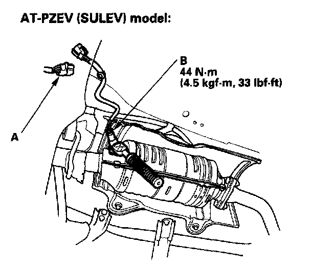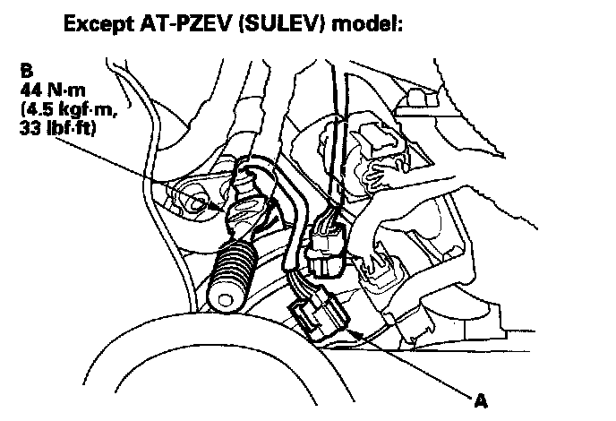 1. Disconnect the secondary HO2S 4P connector (A), then remove the secondary HO2S (B).