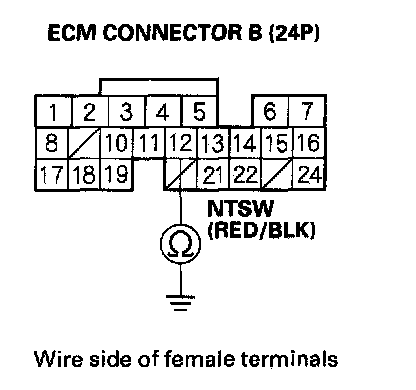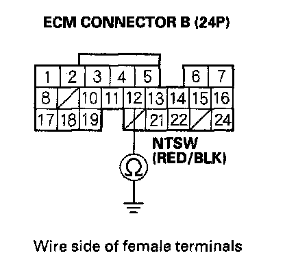 13. Check for continuity between ECM connector terminal B12 and body ground.