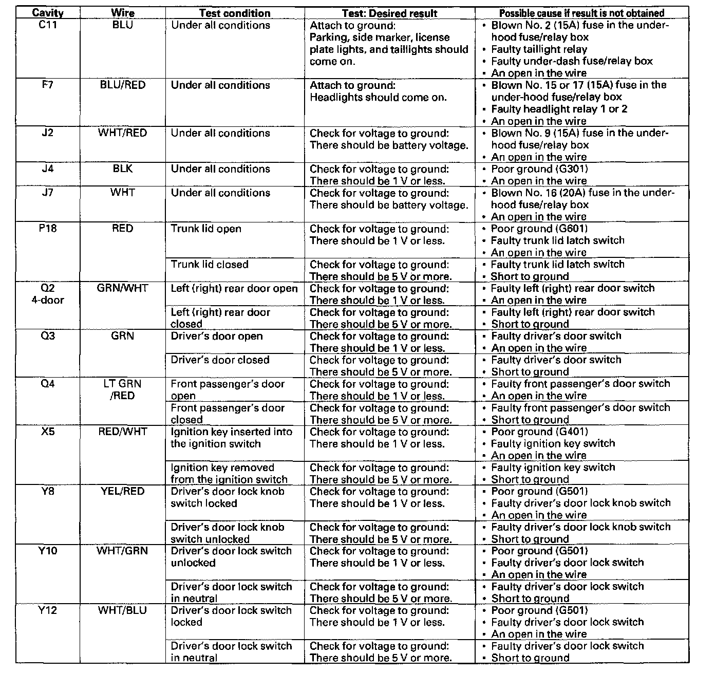 5. Reconnect all connections to the under-dash fuse/relay box, and make these input tests at the appropriate connectors on the under-dash fuse/relay box.
