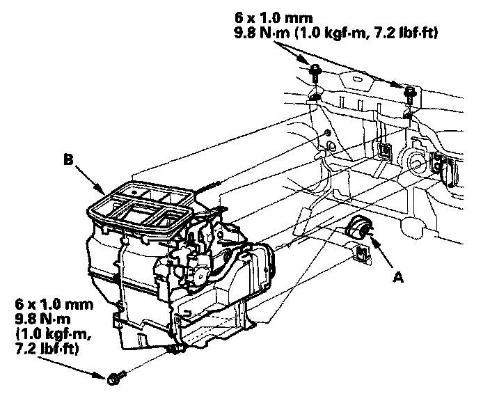 11. Disconnect the drain hose (A), then remove the mounting bolts and the heater unit (B).