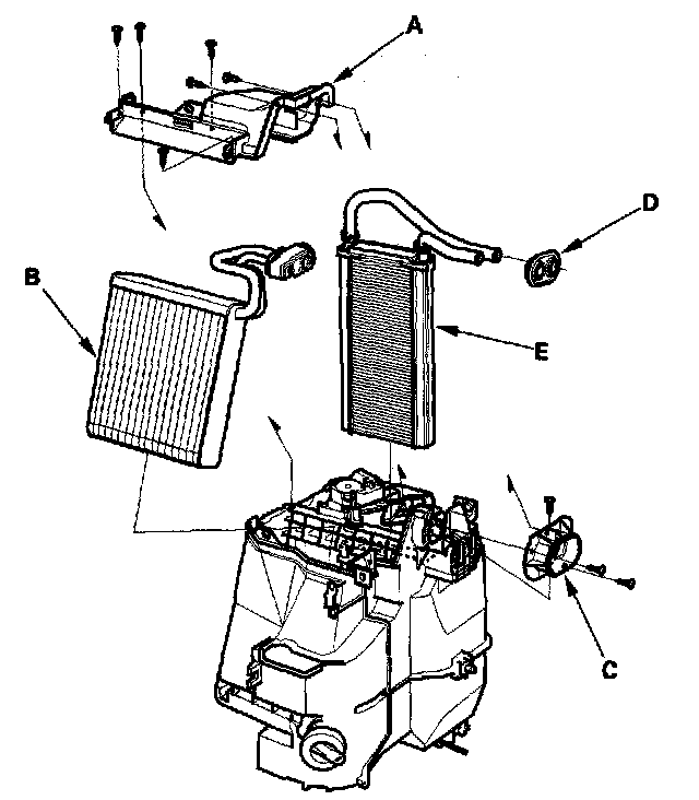 12. Remove the self-tapping screws and the expansion valve cover (A). With air conditioning; carefully pull out the evaporator core (B) so you don't bend the inlet and outlet pipes. Remove the self-tapping screws and the flange cover (C), then remove the grommet (D), and carefully pull out the heater core (E) so you don't bend the inlet and outlet pipes.