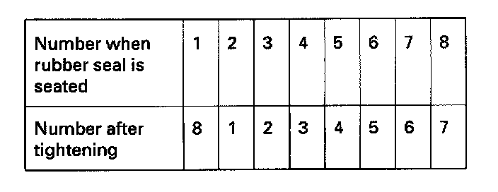 ^ Tighten the filter by turning it clockwise 7 numbers from the one you noted. For example, if number 2 is at the bottom when the seal is seated, tighten the filter until the number 1 comes around the bottom.