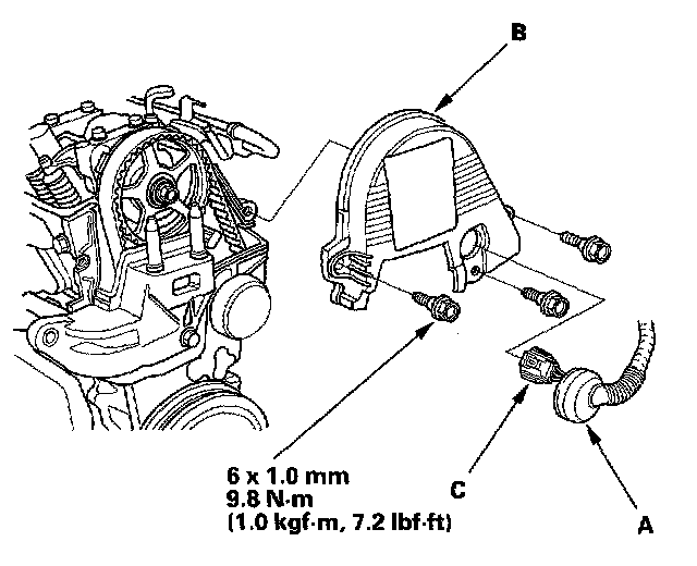 2. Remove the grommet (A) from the upper cover (B), and disconnect the CMP (TDC) sensor connector (C).