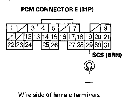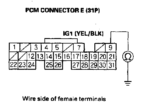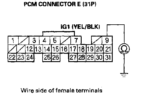 27. Check for continuity between PCM connector terminal E9 and body ground.