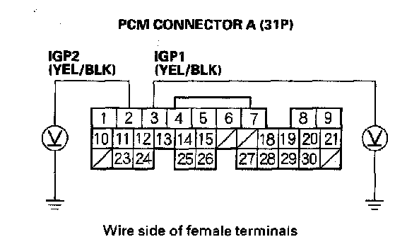 46. Measure voltage between body ground and PCM connector terminals A2 and A3 individually.