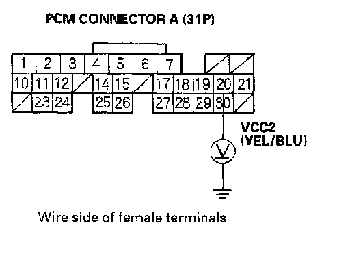 63. Disconnect the 3P connector from each of these sensors, one at a time, and measure voltage between body ground and PCM connector terminal A20 with the ignition switch ON (II).