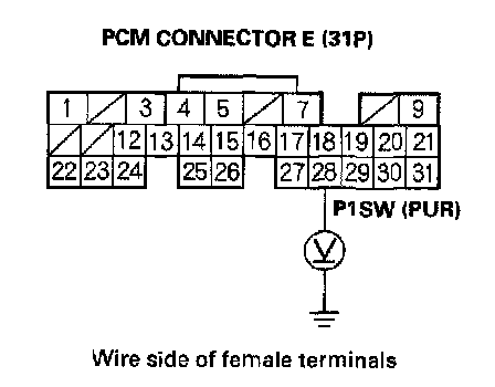 4. Measure voltage between PCM connector terminal E28 and body ground.