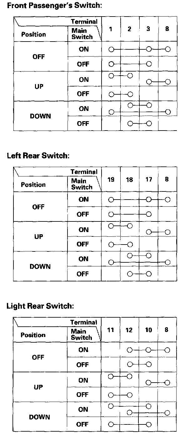 3. Check for continuity between the terminals in each switch position according to the tables.