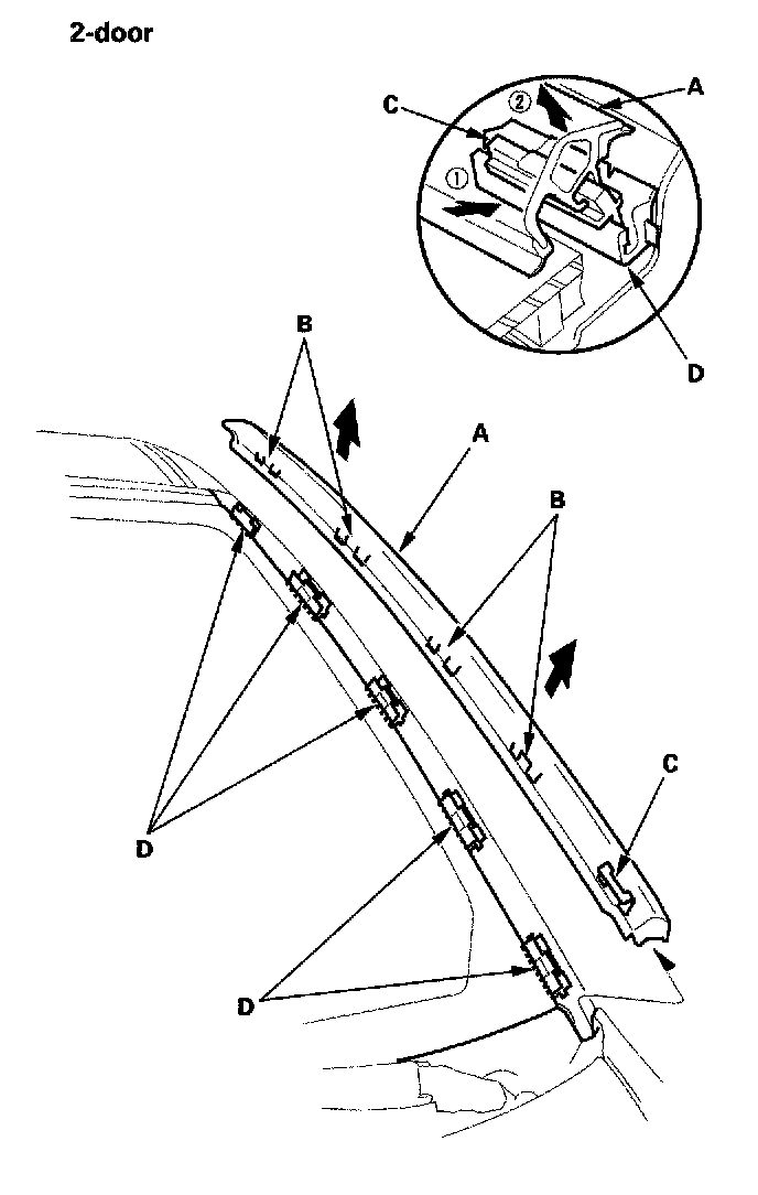 1. Pull up the side trim (A) to release the clips (B, C) from the retainers (D), then remove the trim from each side of the windshield.