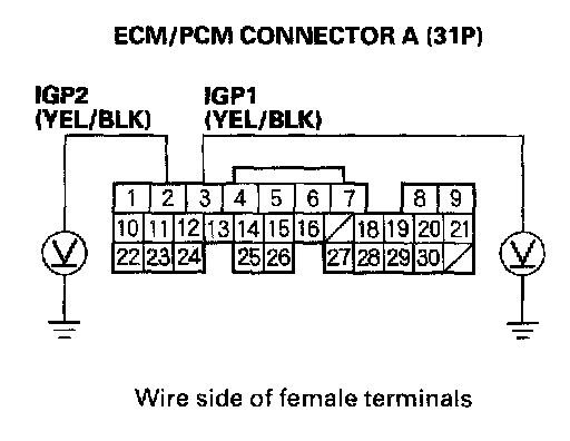44. Measure voltage between body ground and ECM/PCM connector terminals A2 and A3 individually.