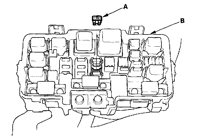 - Turn the ignition switch OFF, and remove the No. 6 ECU (ECM/PCM) (15 A) fuse (A) from the under-hood fuse/relay box (B) for 10 seconds.