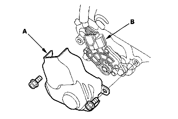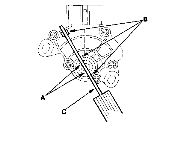 7. Align the cutouts (A) on the rotary-frame with the neutral positioning cutouts (B) on the transmission range switch, then put a 2.0 mm (0.08 inch) feeler gauge blade (C) in the cutouts to hold it in the N position.