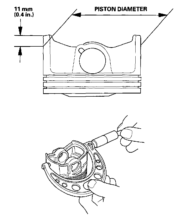 3. Measure the piston diameter at a point 11 mm (0.4 inch) from the bottom of the skirt. There are two standard-size pistons (No Letter or A, and B). The letter is stamped on the top of the piston. Letters are also stamped on the block as cylinder bore sizes.