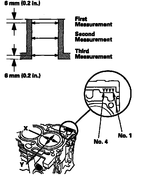 4. Measure wear and taper in direction X and Y at three levels in each cylinder as shown. If measurements in any cylinder are beyond the oversize bore service limit, replace the block. If the block is to be rebored, Refer to step 7 after reboring.