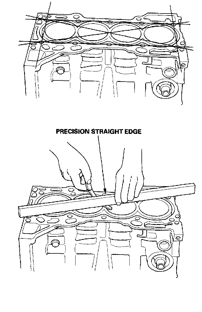 6. Check the top of the block for warpage. Measure along the edges and across the center as shown.