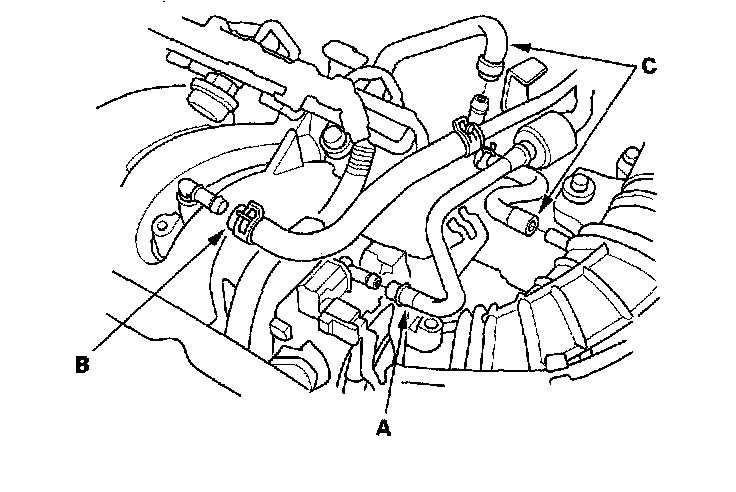 11. Install the EVAP canister hose (A), brake booster vacuum hose (B), and vacuum hoses (C).