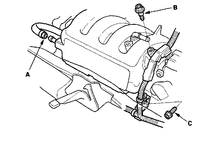 2. Remove the evaporative emission (EVAP) canister hose (A), brake booster vacuum hose (B), and vacuum hoses (C).