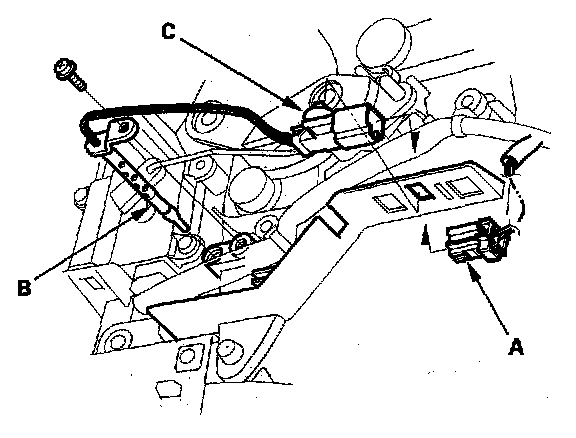 3. Disconnect the 2P connector (A) from the evaporator temperature sensor (B), then remove the connector clip (C). Remove the self-tapping screw, and carefully pull out the evaporator temperature.