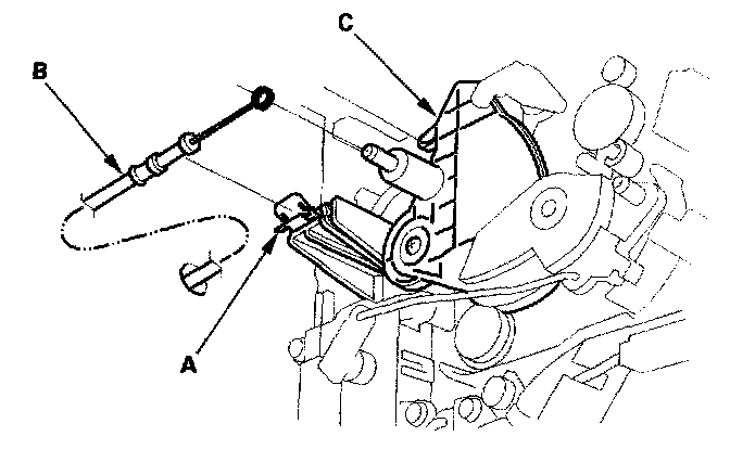 Heater Valve Cable Adjustment1. From under the hood, open the cable clamp (A), then disconnect the heater valve cable (B) from the heater valve arm (C)