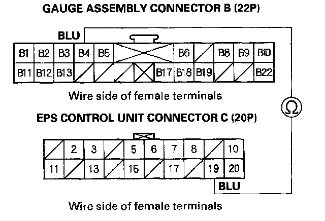8. Check for continuity between the gauge assembly connector B (22P) No. 4 terminal and the EPS control unit connector C (20P) No. 19 terminal.