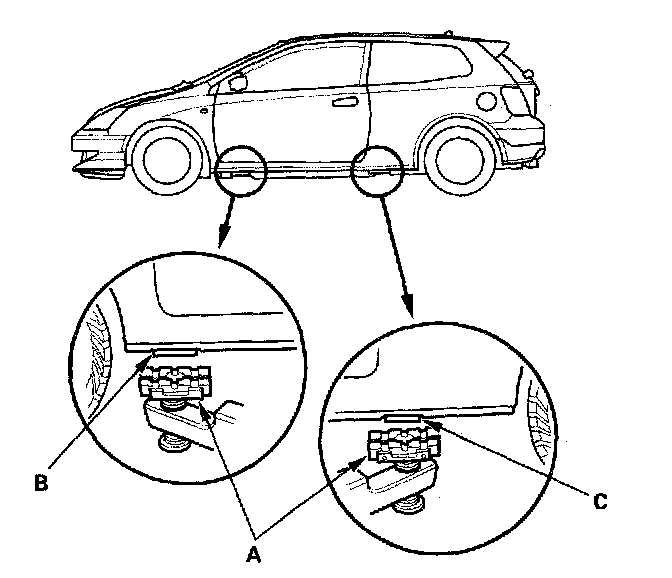 1. Position the hoist lift blocks (A), on safety stands, under the vehicle's front support points (B) and rear support points (C).