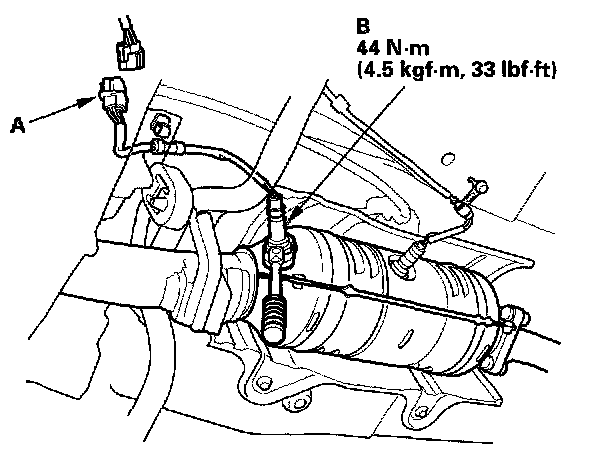 1. Disconnect the A/F sensor 4P connector (A), then remove the A/F sensor (B).