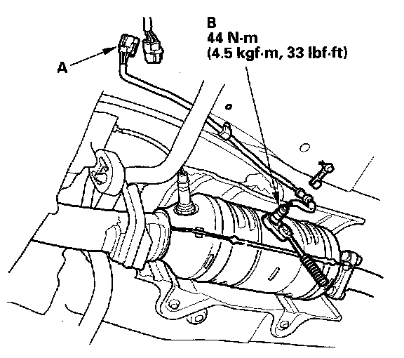 1. Disconnect the secondary HO2S 4P connector (A), then remove the secondary HO2S (B).