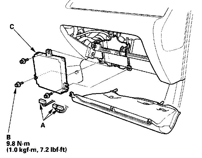 1. Remove the passenger's dashboard lower cover, the passenger's kick panel, and the glove box.