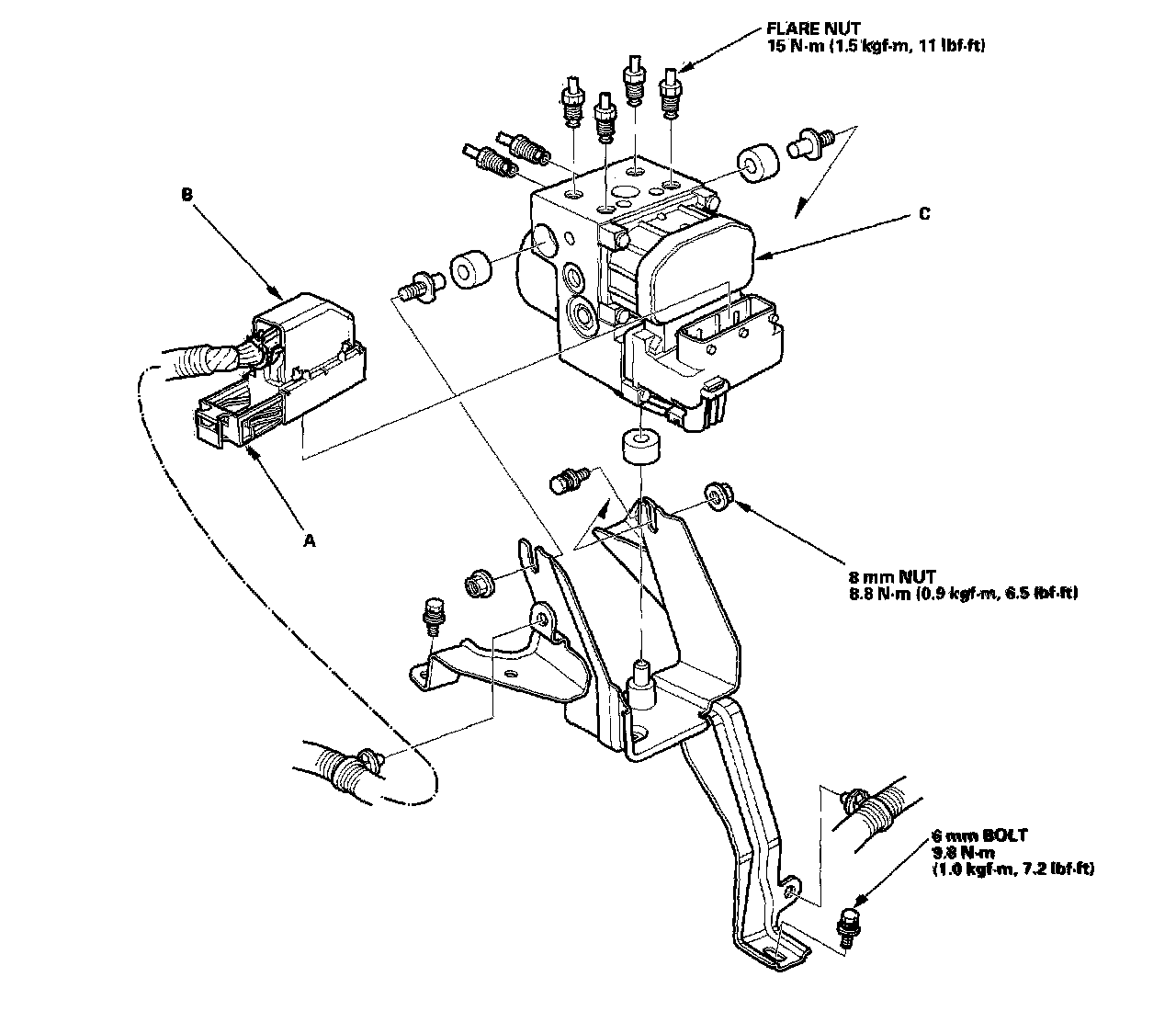 3. Disconnect the six brake lines from the ABS modulator-control unit (C).