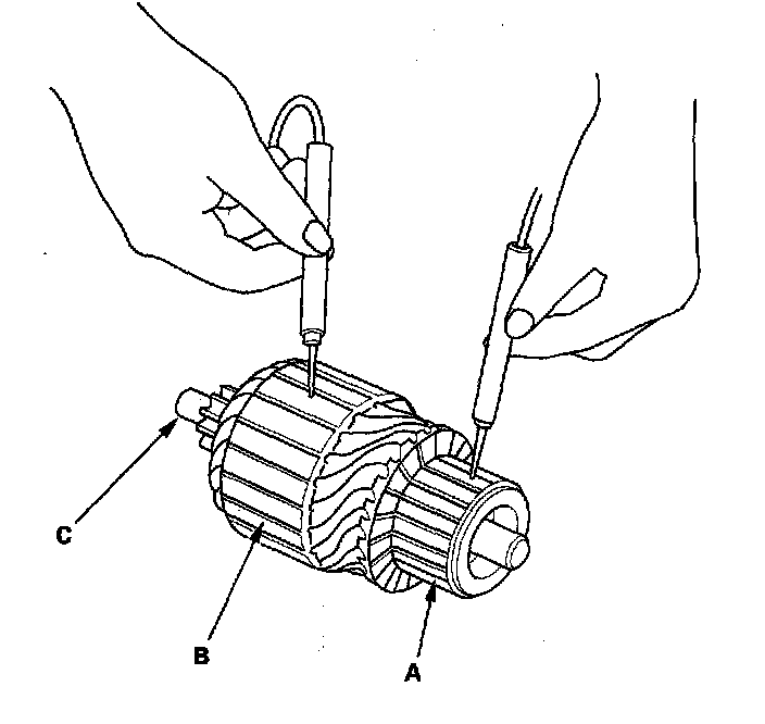 10. Check with an Ohmmeter for continuity between the commutator (A) and armature coil core (B), and between the commutator and armature shaft (C). If there is continuity, replace the armature.