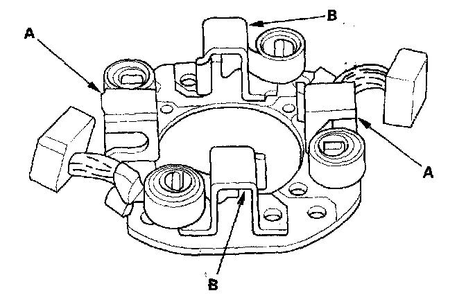 14. Check for continuity between the (+) brush holder (A) and (-) brush holder (B). If there is continuity, replace the brush holder assembly.
