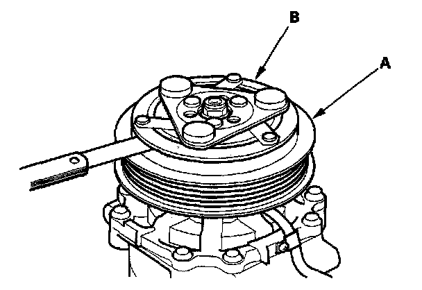 3. Measure the clearance between the rotor pulley (A) and the armature plate (B) all the way around. If the clearance is not within specified limits, remove the armature plate and add or remove shims as needed to increase or decrease clearance.