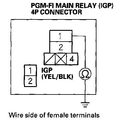 18. Check for continuity between body ground and the PGM-FI main relay (IGP) 4P connector terminal No.2.