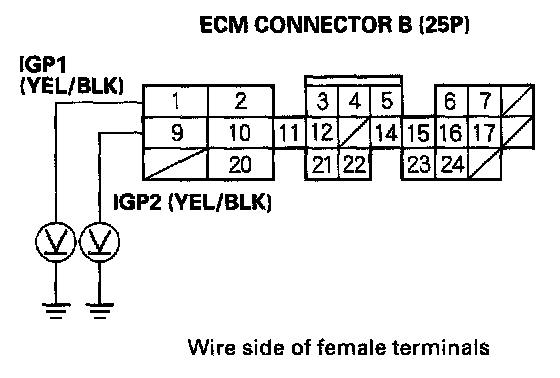 21. Check for continuity between PGM-FI main relay (IGP) 4P connector terminal No.2 and body ground.