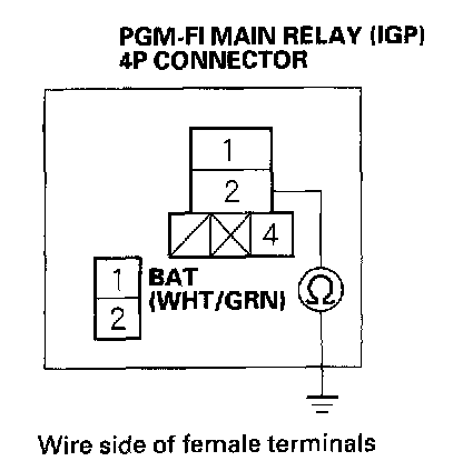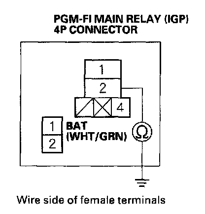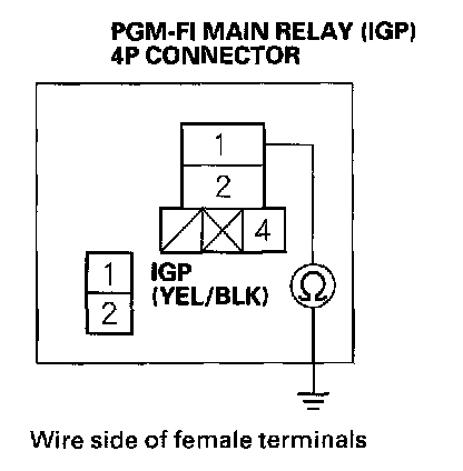 18. Check for continuity between body ground and the PGM-FI main relay (IGP) 4P connector terminal No. 2.