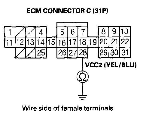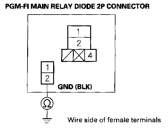 29. Check for continuity between body ground and PGM-FI main relay diode 2P connector terminal No. 2.