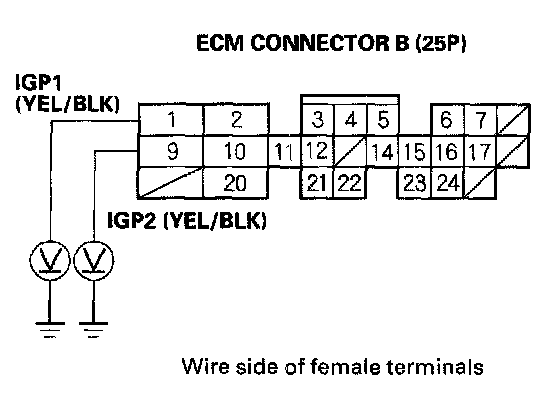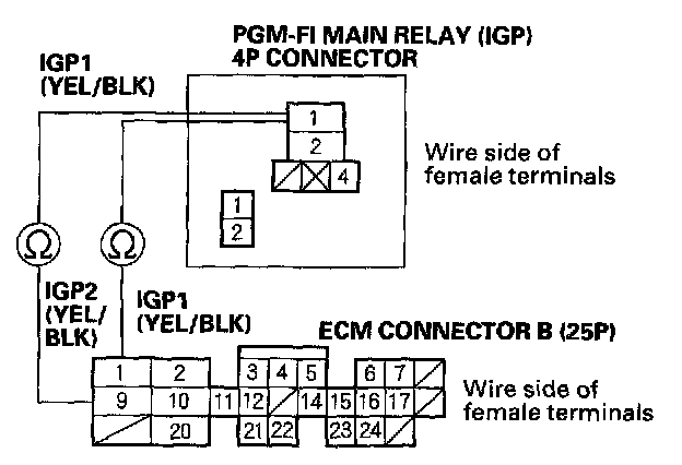 21. Check for continuity between PGM-FI main relay (IGP) 4P connector terminal No. 2 and body ground.